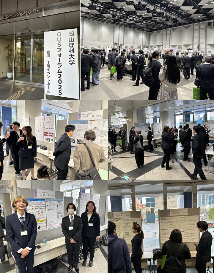 2025年11月21日にOUSフォーラム2025が岡山コンベンションセンターで開催されました。OUSフォーラムは岡山理科大の研究シーズを一般に広く知ってもらうために毎年開催されており、生物科学科からも多くの研究室が参加しました。この時期の発表は、年明けの卒業論文や修士論文を見据えた発表にもなります。学生たちはこれまでの成果を頑張って発表し、良いアドバイスを多くもらえたようです。益々の研究の発展を期待します!