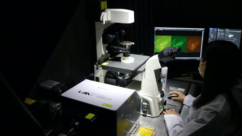 濱田研では特に「生きている植物の内部を動画で撮影する」ライブイメージング解析に力を入れており、世界に先駆けて誰も見たことがない映像を撮影しています。例えば、植物が高温にさらされた時に植物内部で起きる生理現象を捉えることによって、近年の夏場の異常高温に対処するための栽培法の確立を目指しています。
