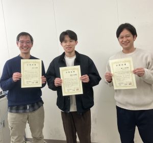 2025年度バイオインフォマティクス技術者認定試験において、本学科から大学院生1名(飯間匠海さん 中央)および教員2名(松永先生 左、橋川先生 右)が受験し、全員が合格いたしました。